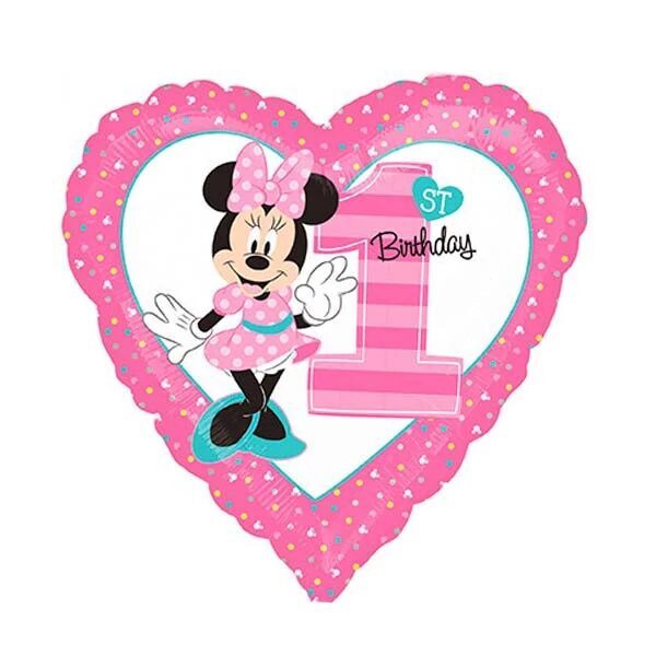 оздушный шар в форме сердца с Минни Маус и надписью "1-ый день рождения". Розовая и бирюзовая цветовая гамма сейчас очень модная. Такой шарик идеально подойдёт для празднования годовасия вашей дочурки! Размер шара в надуве: 45 см. Выполнен из миларовой пленки, благодаря чему шар будет летать несколько дней.