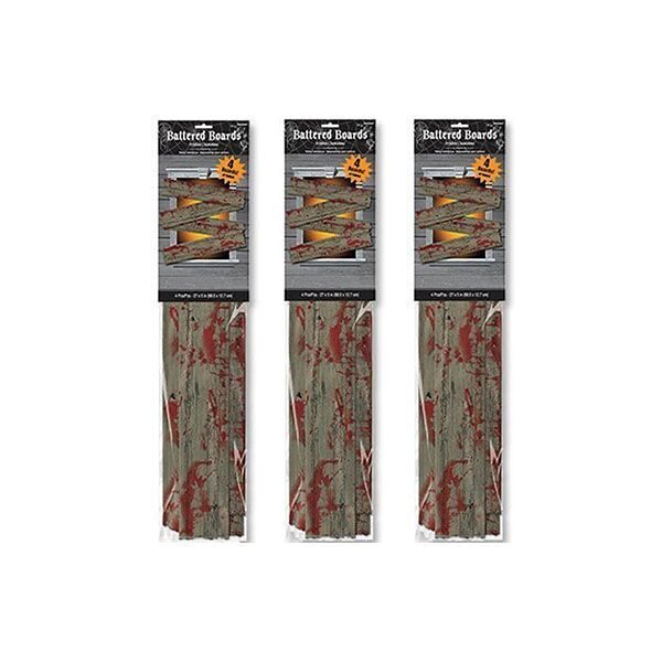 Четыре кровавые доски для имитации заколоченных окон заброшенного дома. В комплекте 4 баннера из пластика размером 69 см х 13 см.