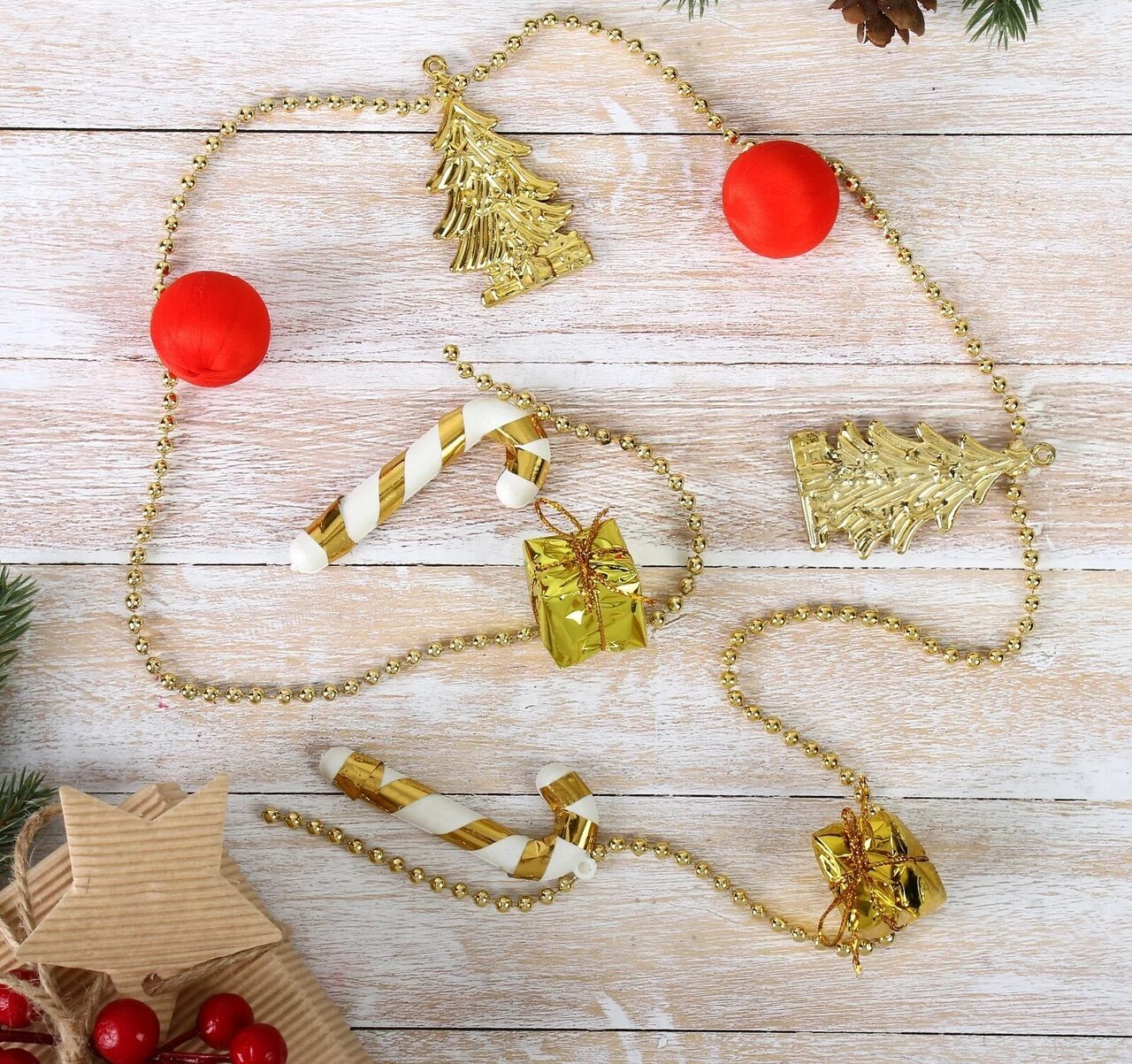 Нить блестящих маленьких шариков, украшенная золотыми подарочками, ёлочками и красными шариками, преобразит новогоднюю ель и сделает её более нарядной.