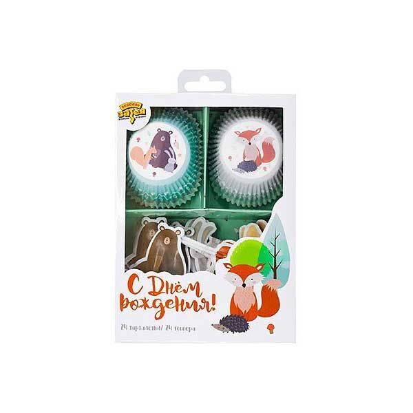 Лесные жители – лисичка и ежик, заяц и белочка, и конечно, медведь собрались на опушке, чтобы устроить настоящий праздник всем-всем-всем! В набор входят аксессуары для украшения 24 капкейков: 24 двусторонних топперов на пиках (4 дизайна) и 24 тарталетки из пищевого пергамента (2 дизайна), диаметр дна тарталетки - 5см, высота - 3 см. Размер пик ~8 ,5см.