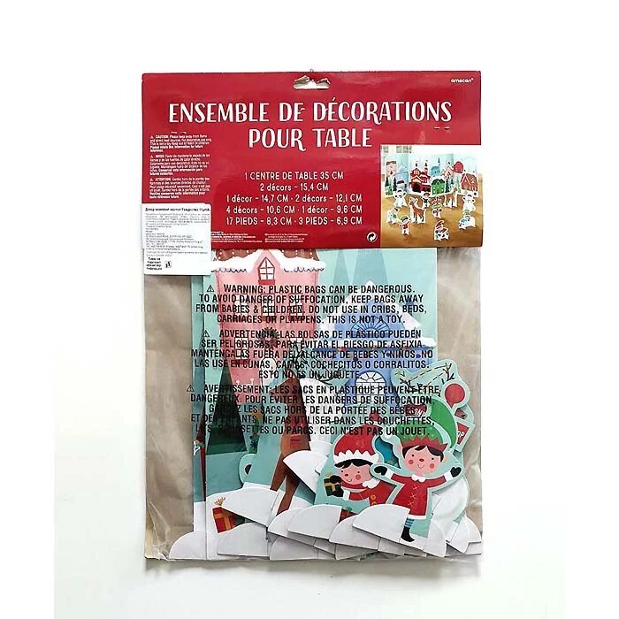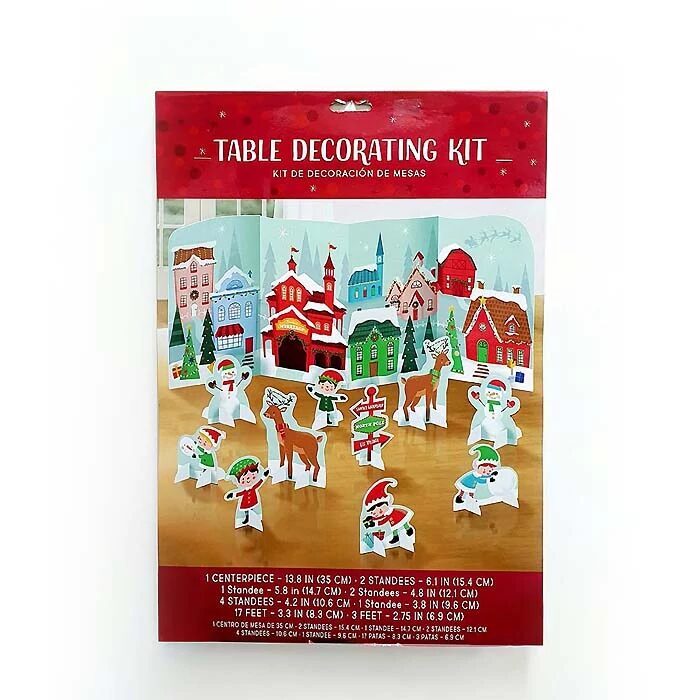 Целая картонная эльфийская деревня с домиками со снеговиками и оленями, веселыми эльфами и указателем. Основная декорация-сцена размером 35 см выполнена из плотного картона, как и все остальные небольшие декорации. Размер фигурок от 7 до 15 см, всего 10 фигурок и ножки-подставки к ним. Отличное украшение новогоднего стола, а также отличная игра для детей.