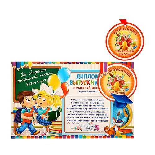 Все элементы изготовлены из картона. У красочной фоторамки есть специальная отгибающаяся ножка, благодаря которой её можно поставить на самое видное место на работе или дома. Впишите в диплом выпускника начальной школы личные пожелания. Яркая медаль с лентой подчеркнёт торжественность момента и будет гордо красоваться на груди ребёнка. Спустя годы будет так здорово посмотреть на снимок и вспомнить счастливые моменты беззаботного детства.