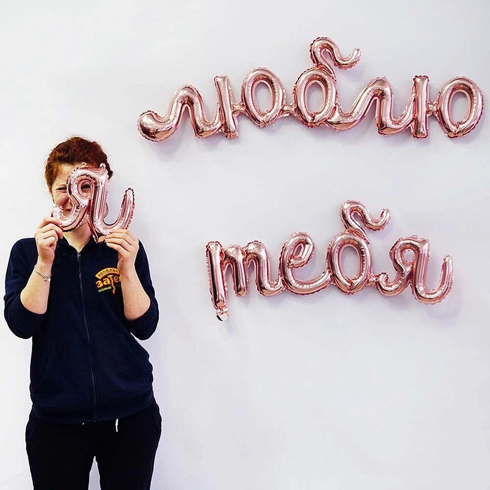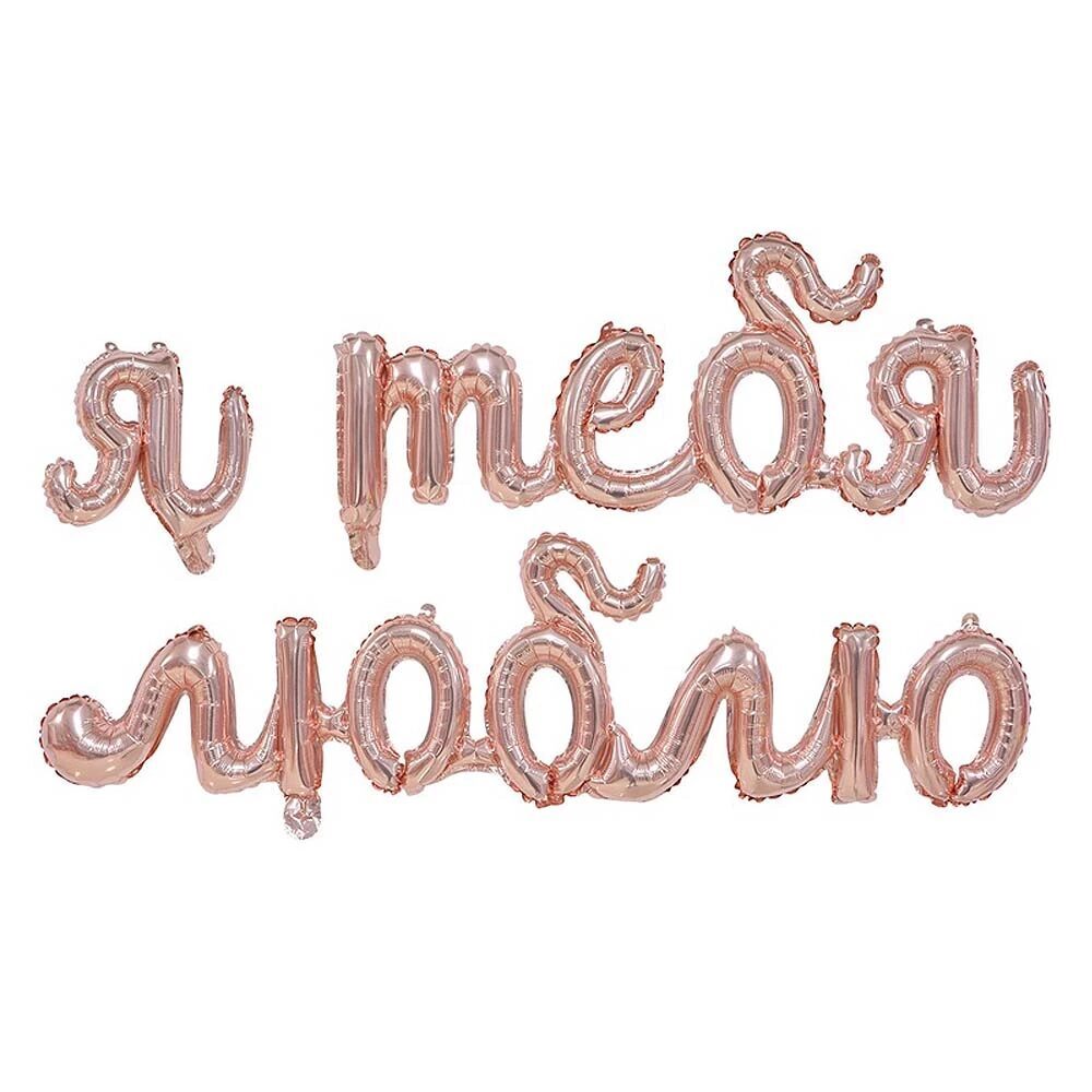 Фраза "Я ТЕБЯ ЛЮБЛЮ", изготовленная из полимерной фольгированной плёнки, станет прекрасным обозначением праздника. Текст фразы состоит из следующих деталей-слов (указаны размеры каждого элемента в надутом виде): «Я» - 21(w)*18cm(h), «ТЕБЯ» - 71(w)*31(h)cm, «ЛЮБЛЮ» - 100(w)*28 (h)cm. Каждая часть содержит клапан и хвостики для подвешивания с отверстиями. Инструкция: 1) надуваем каждую деталь воздухом с помощью входящей в комплект трубочки; 2) соединяем надутые элементы в фразу с помощью входящей в комплект ленты.