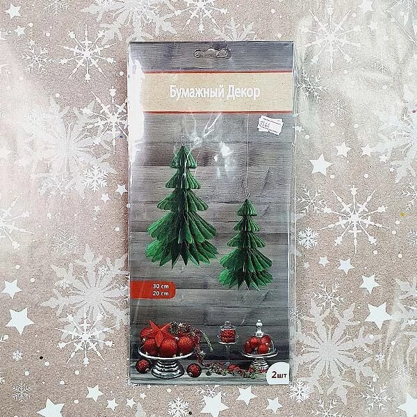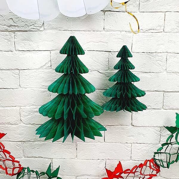 Комплект декоративных украшений интерьера из бумаги. В упаковке 2 объёмных подвесных фигуры"Елки"с размерами: ширина 22cм*высота 30cм и шарина 14cм*высота 20cм.