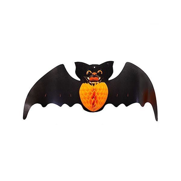 Объёмная бумажная подвесная фигура размером 25х57 см в форме летучей мыши - отличное украшение на Хэллоуин. Фигура представлена в сложенном виде: собрать "Летучую мышь" можно развернув края и закрепив их с помощью двухстороннего скотча, размещенного на самом изделии.