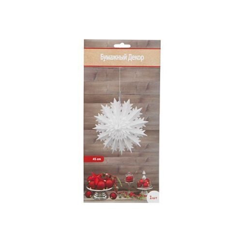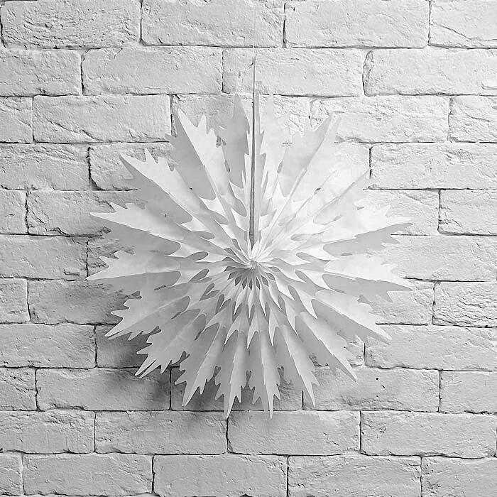 Легкая воздушная снежинка выполнена из полупрозрачной бумаги. Диаметр снежинки 45см, ширина объемной фигуры 13см. Просто разложите ее как веер и соедините концы скрепкой (входит в комплект). Снежинку можно подвесить за петельку как елочный шар или использовать как настольный декор.