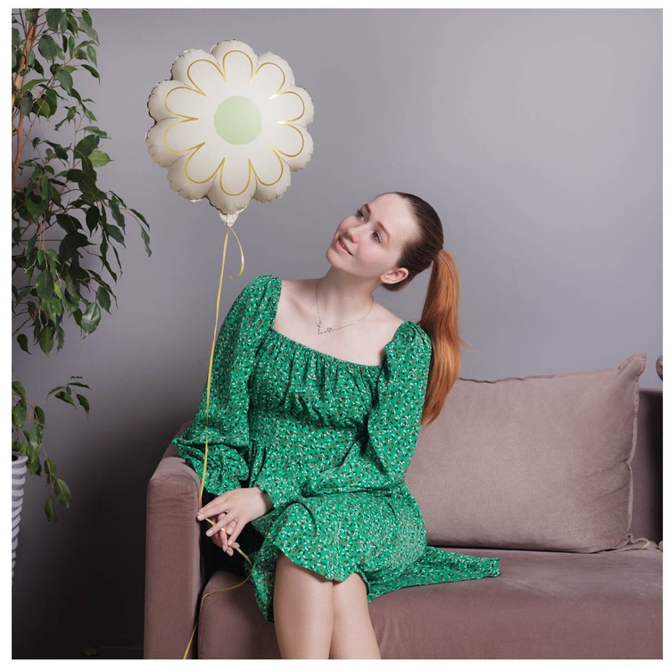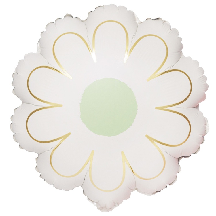 Объемный, фигурный, фольгированный шар выполнен в форме элегантного цветка – ромашки с нежной матовой фактурой, украшенной тонкими золотыми прожилками. Такой шар станет стильным декором на вашем празднике! Изготовлен из качественных материалов (полимерная фольгированная пленка). Размер шара в ненадутом виде 43x53см.