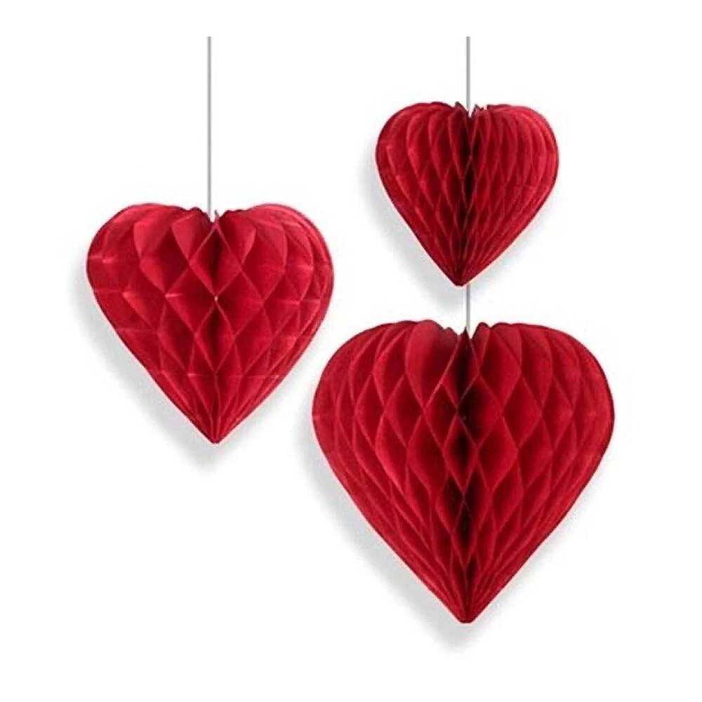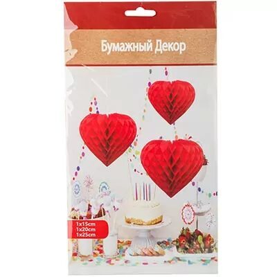 Подвесные объемные сердца – прекрасный декор для выражения своих чувств! Сердца выполнены из сотовой бумаги. В упаковке 3 сердца размером 15, 20, 25см. В набор входят скрепки для быстрого соединения фигур.