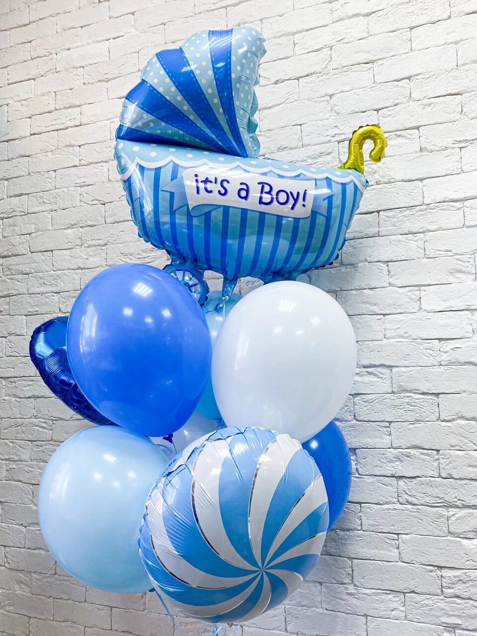 - Фонтан из шаров (1 коляска фигурная, 6 латексных шаров, 1 фольгированное сердце, 1 фольгированная карамелька)
