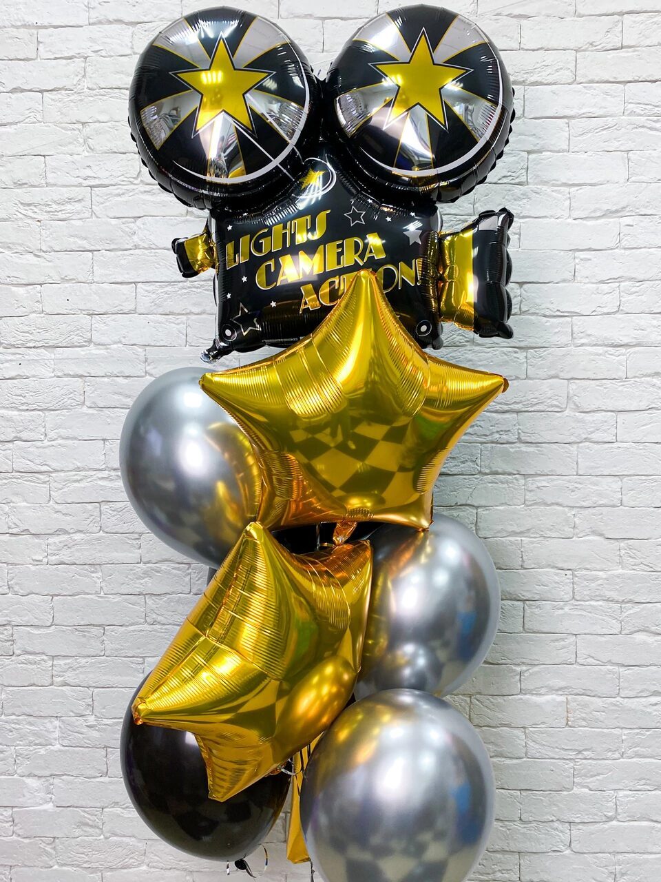 - Фонтан из воздушных шаров (1 фольгированная камера, 3 фольгированные звезды, 3 латексных шара хром, 3 латексных шара пастель)