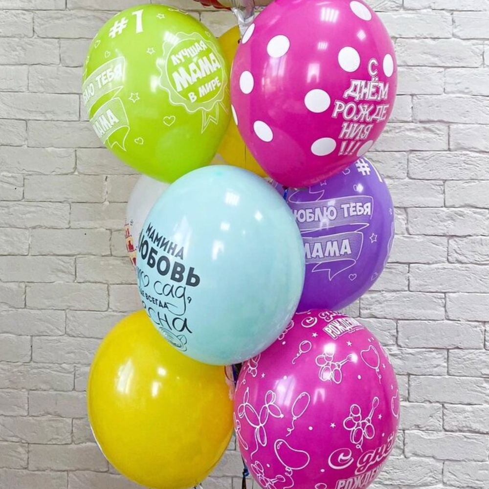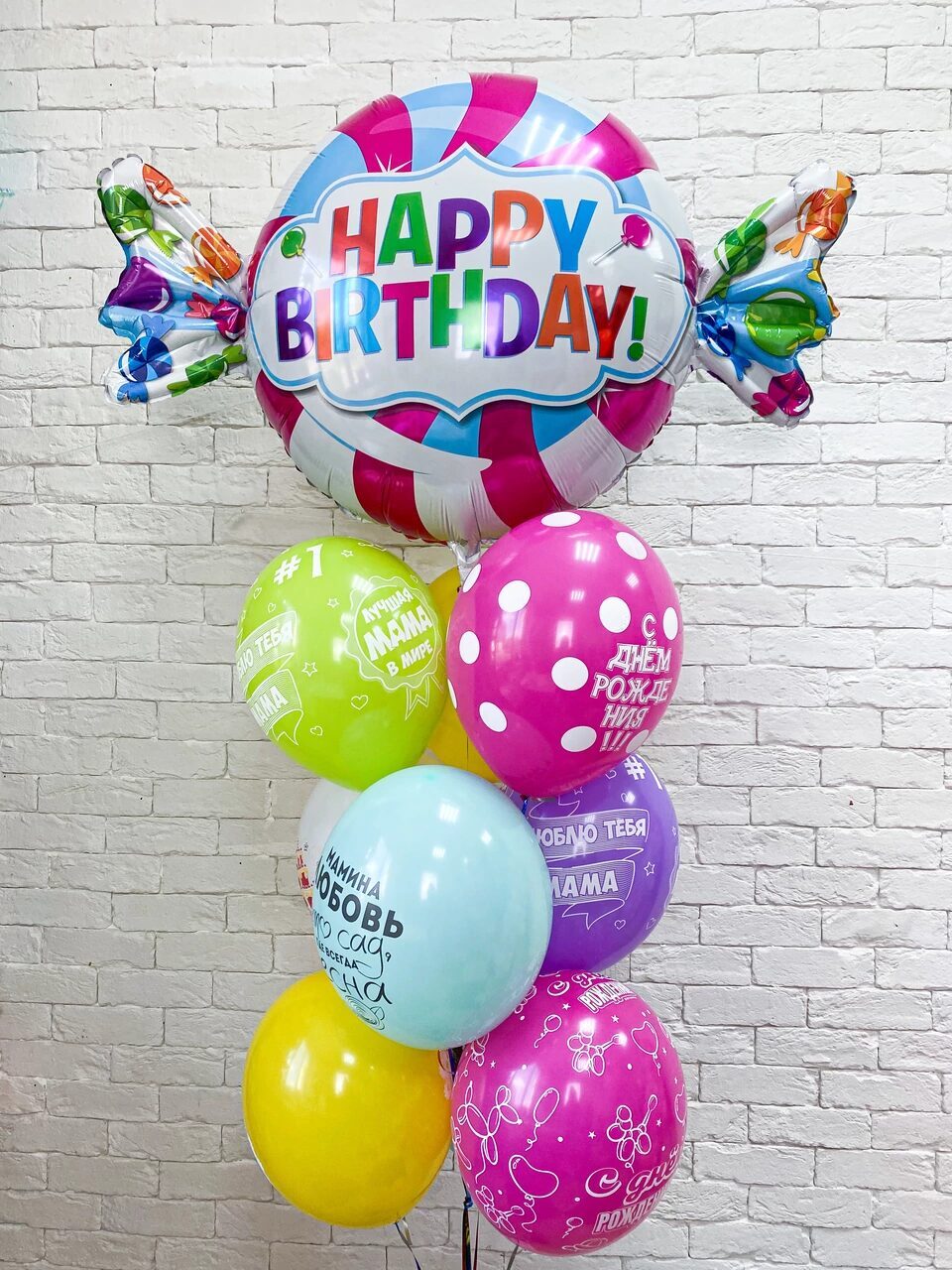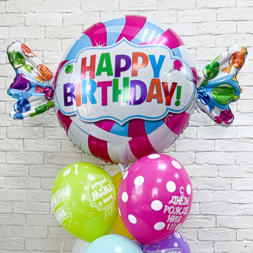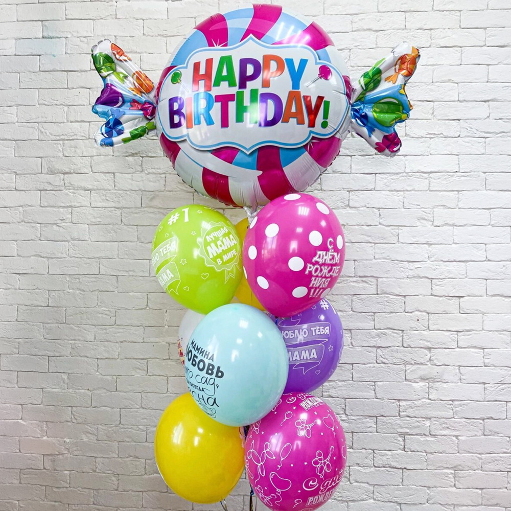 - Фонтан из воздушных шаров (фольгированный фигурный шар в виде конфеты и 9 латексных шаров с надписями)