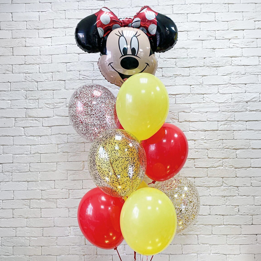- Фонтан из воздушных шаров для девочки (фигура Минни Маус, 6 латексных шаров ассорти, 3 латексных шара с конфетти)
