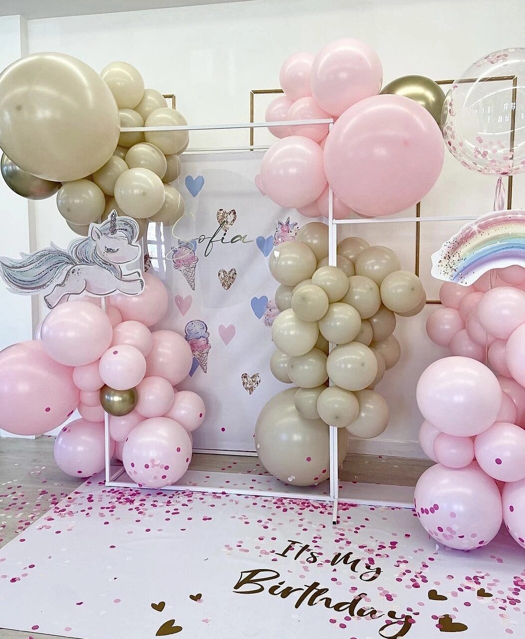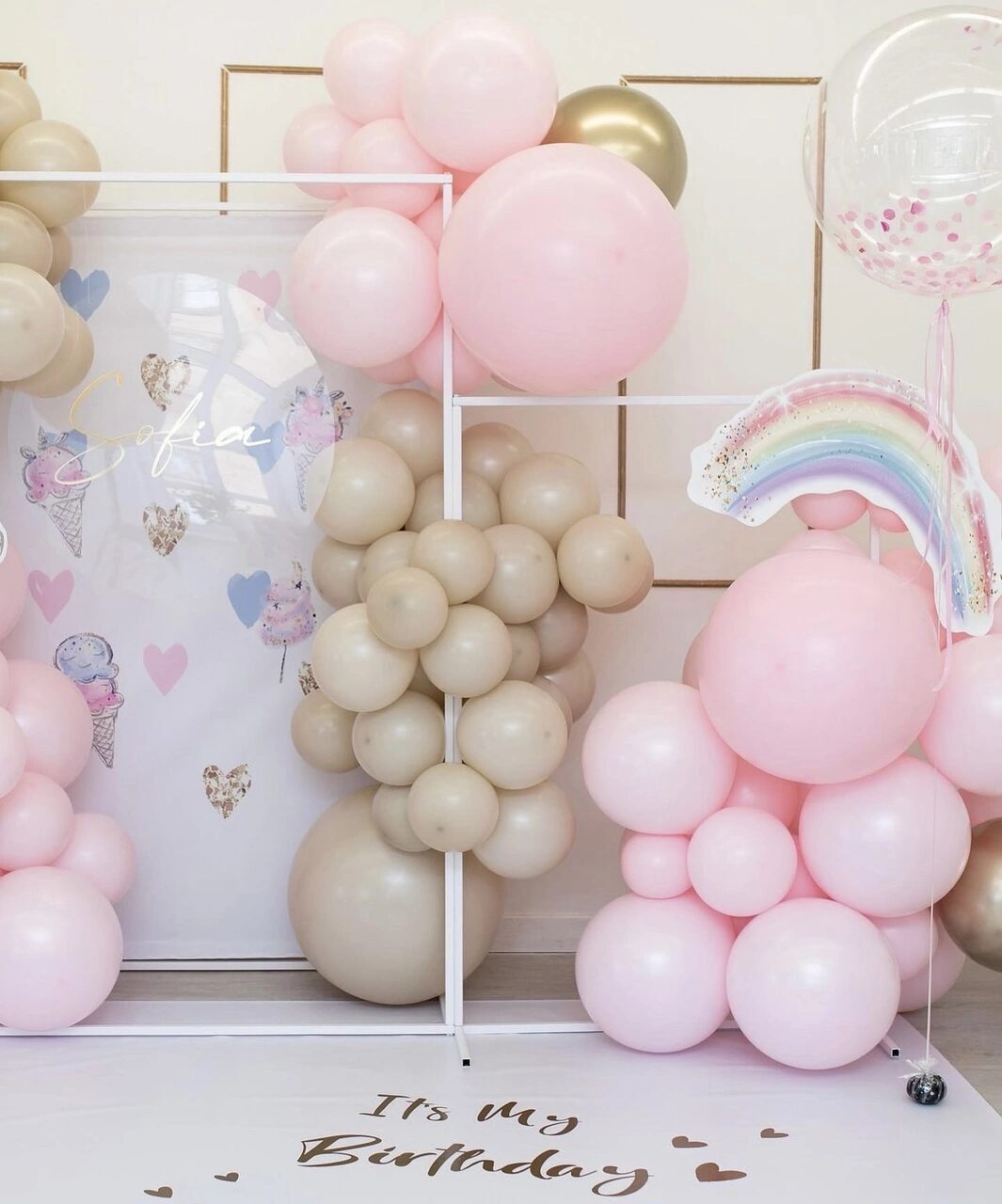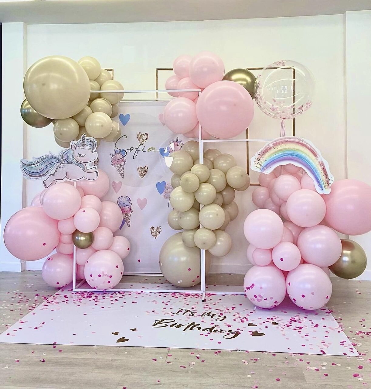 - Фотозона на декоративном квадратном каркасе, разнокалиберная с баннером под заказ и дополнительным декором.
