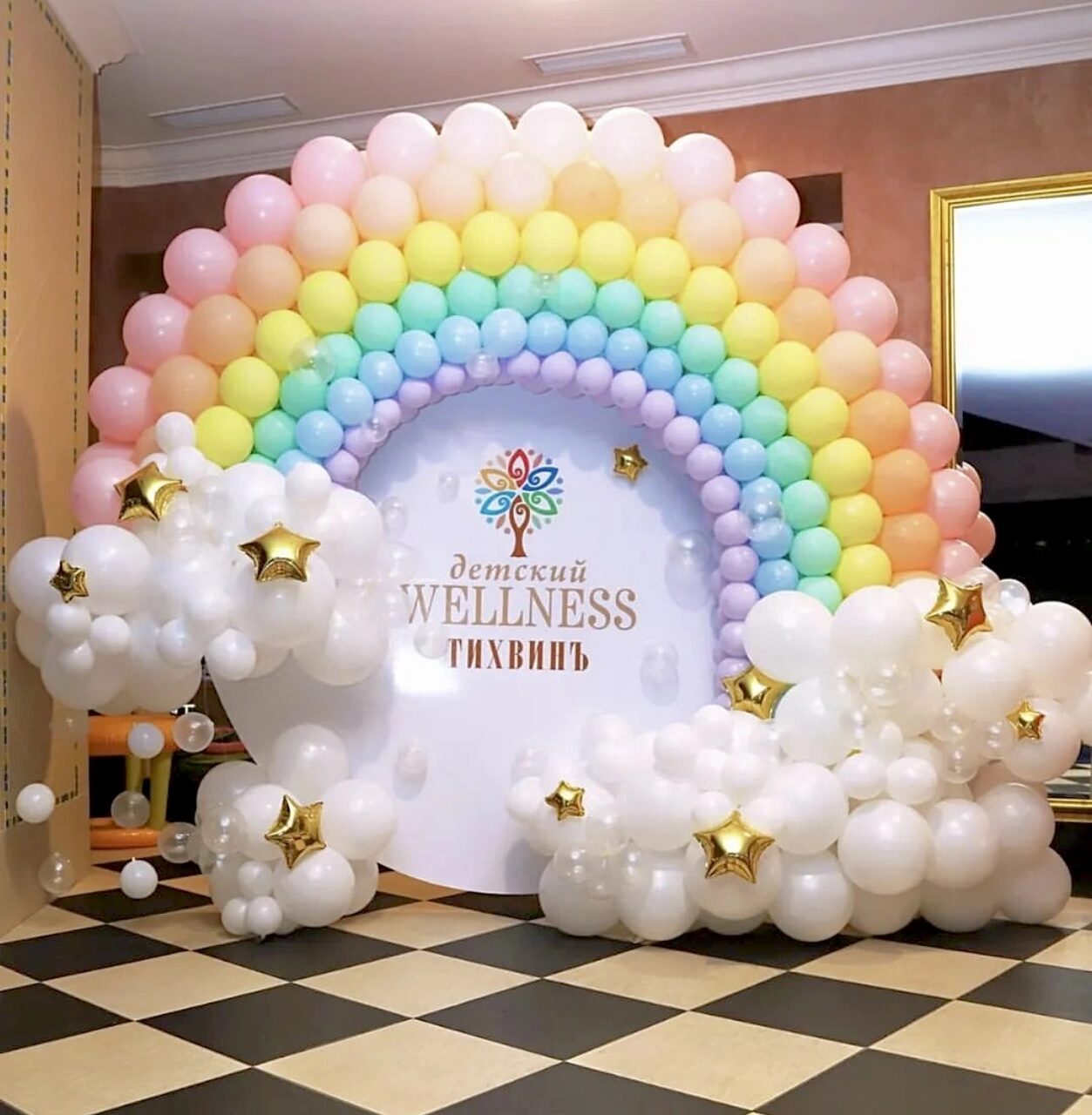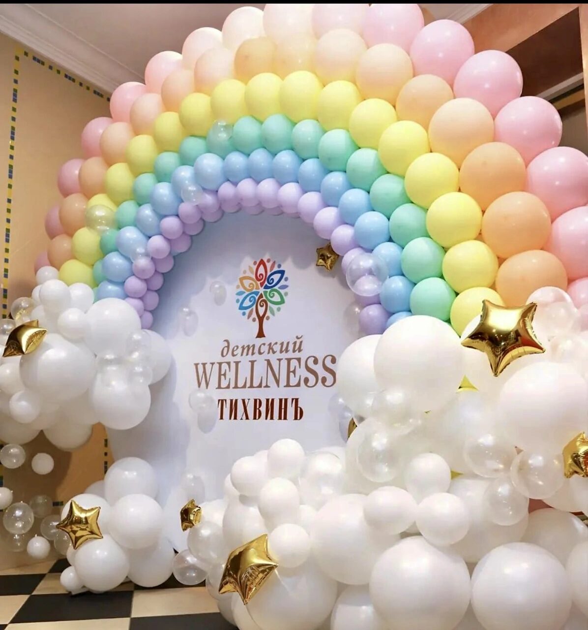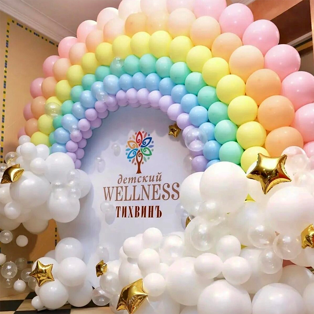 - Композиция состоит из пастельных латексных шаров разного дюйма, с добавлением хромированных звезд