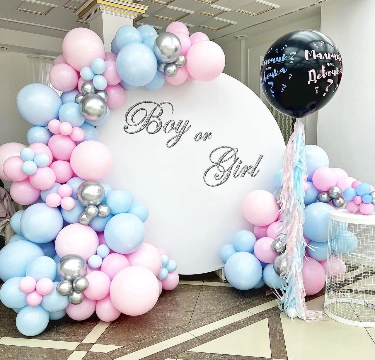- Композиция состоит из пастельных латексных шаров разного дюйма, с добавлением хромированных шариков.