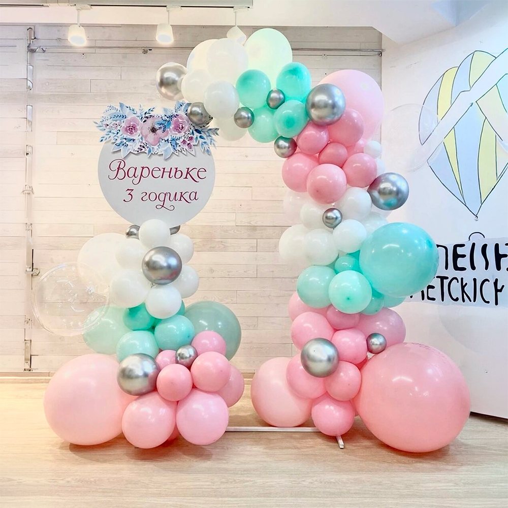 - Композиция состоит из латексных, хромированных шаров разного дюйма, с добавлением прозрачных шаров.
