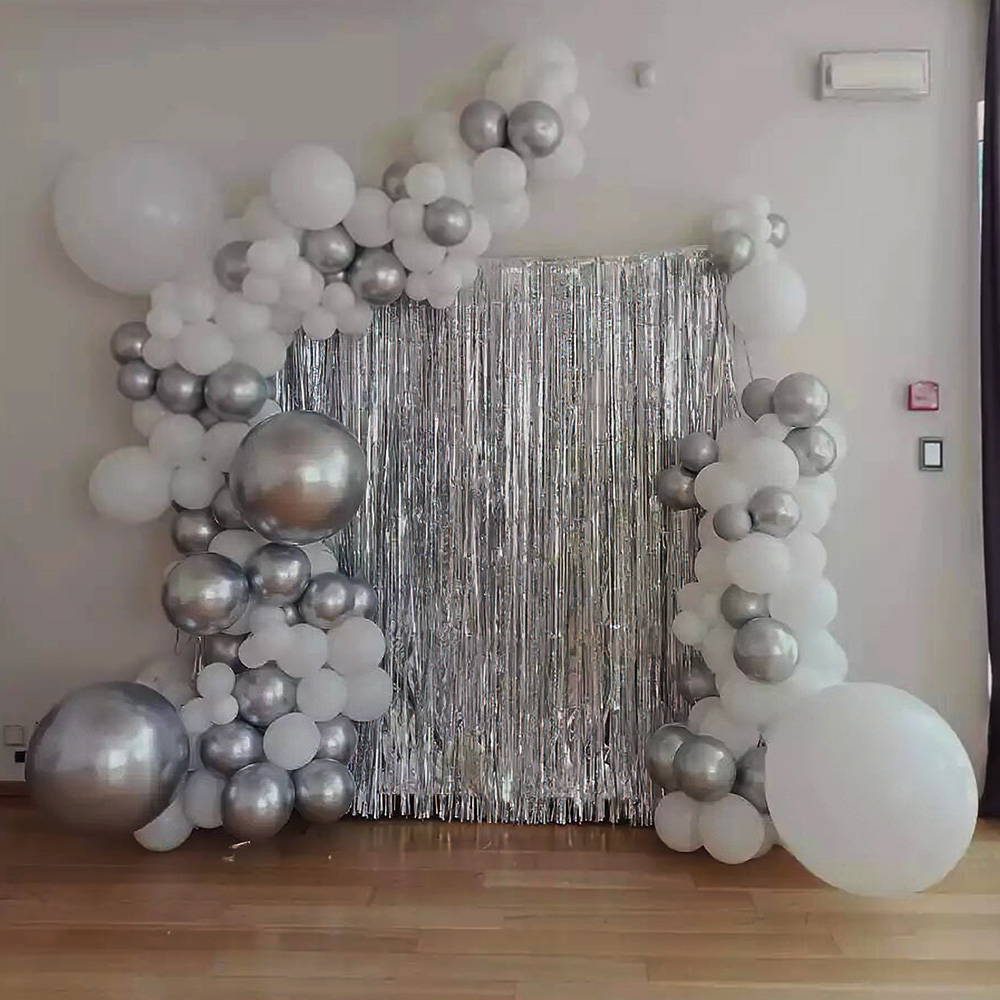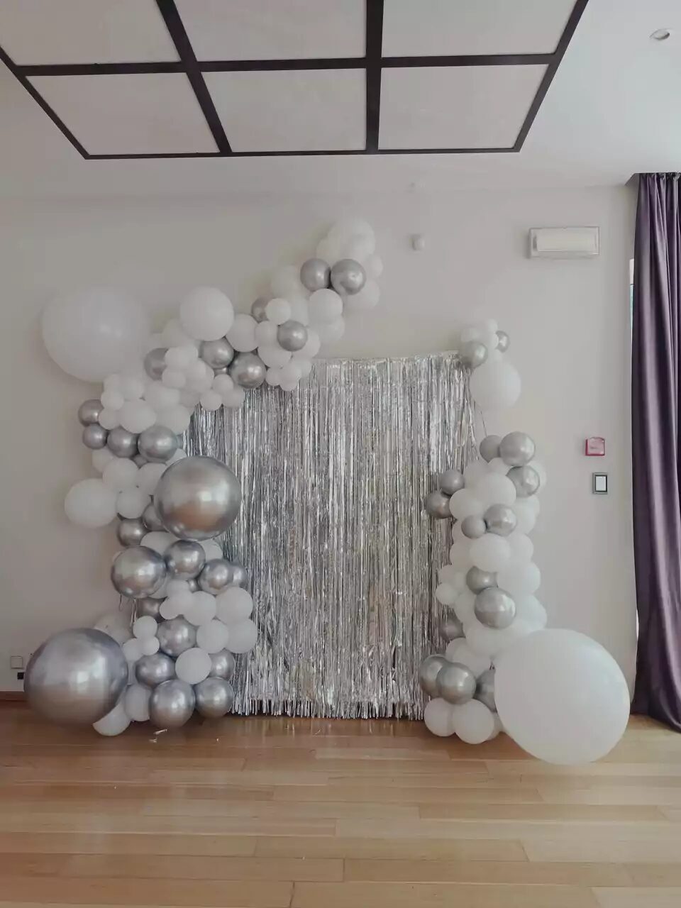 - Фотозона настенная, разнокалиберная с серебряным занавесом