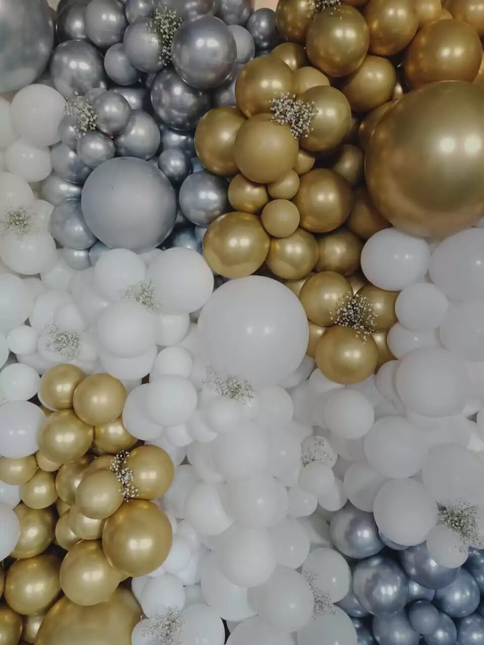 Композиция состоит из латексных, хромированных шаров разного дюйма, с добавлением живых цветов и олимпийских шаров с индивидуальными надписями под заказ.
