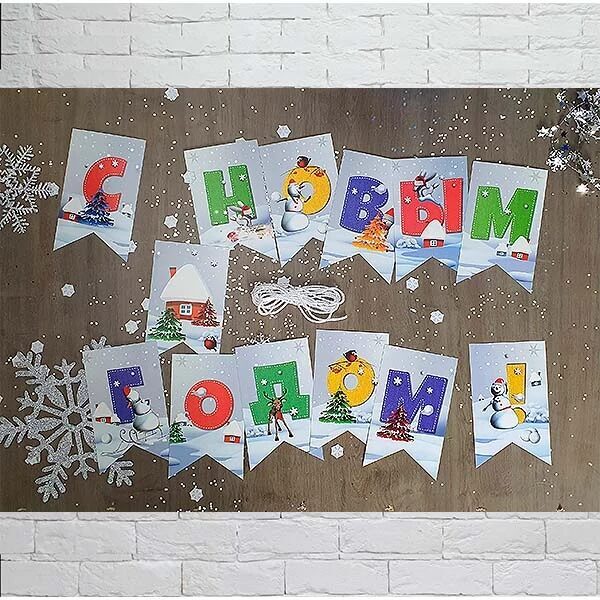Соберите новогоднюю гирлянду! Озорные снеговики помогут отметить главный праздник страны. В комплекте 13 вымпелов и лента. Длина ленты 2,5м.