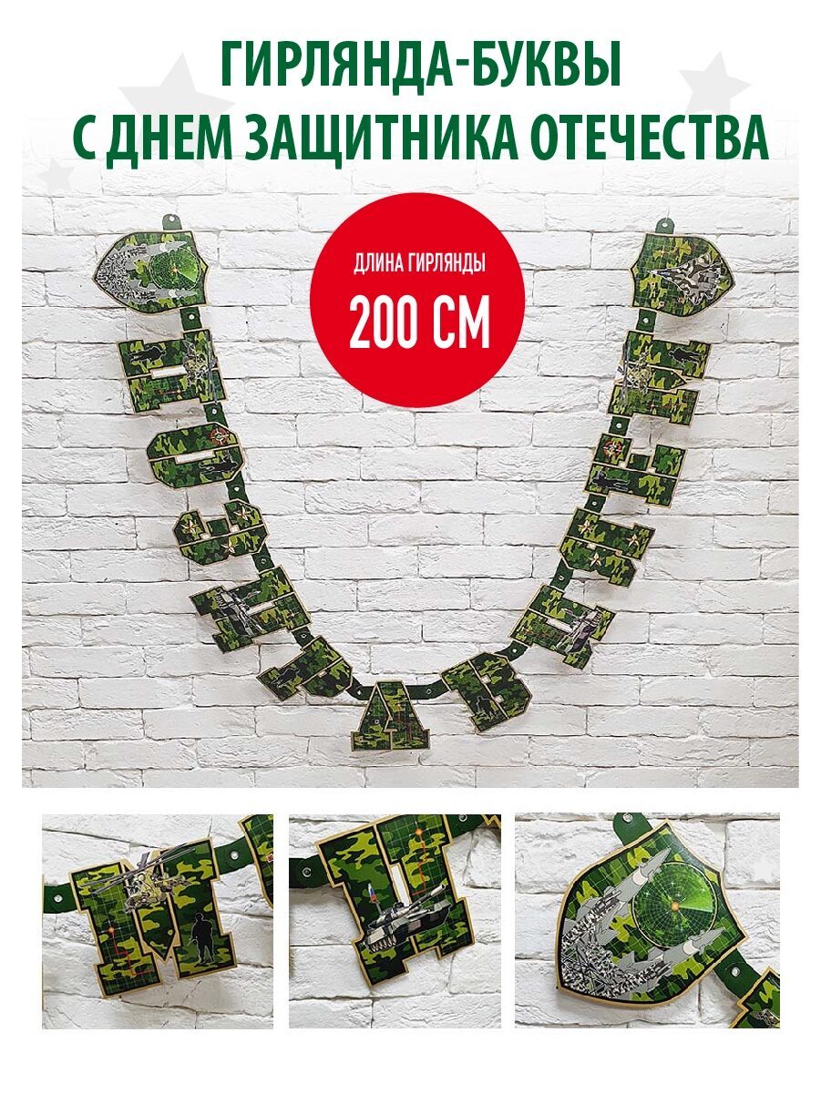 Праздник настоящего мужчины отмечается только так - камуфляжное поздравление с самолетами и другой военной техникой. Буквы скреплены между собой. Длина гирлянды 275 см, на концах гирлянды ленты для закрепления гирлянды. Отличное дополнение празднования 23 февраля.