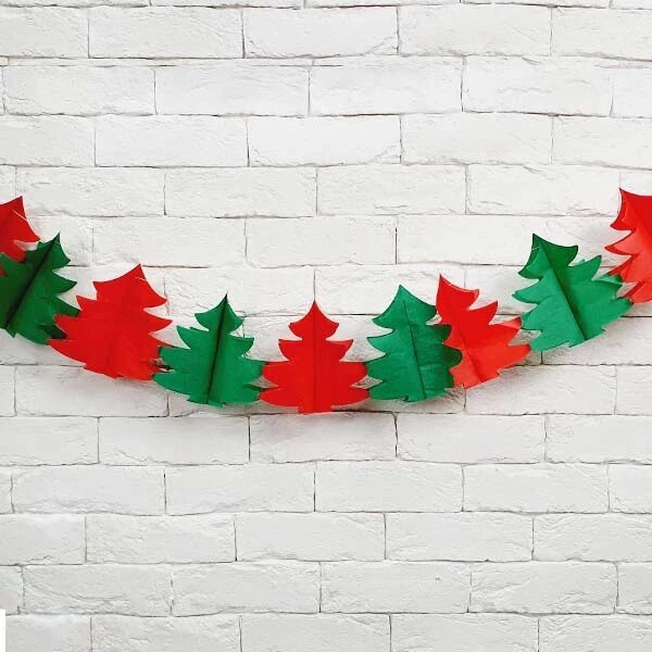 Красивая фигурная гирлянда - объемное, декоративное украшение интерьера из гофрированной бумаги-тишью на Новый Год и Рождество. Повторяющийся элемент выполнен в форме Елочки.