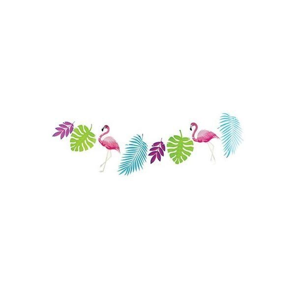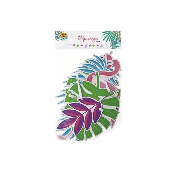 Гирлянда с экзотическими растениями и фламинго отлично украсят вашу гавайскую вечеринку. В комплект входит белая атласная лента длиной 3м и 8 баннеров: листья (2 шт. размером 22x12.5cm, 2 шт. размером 26,5x21cm, 2шт. размером 37x 19cm) и фламино (2 шт. - 38x21cm).