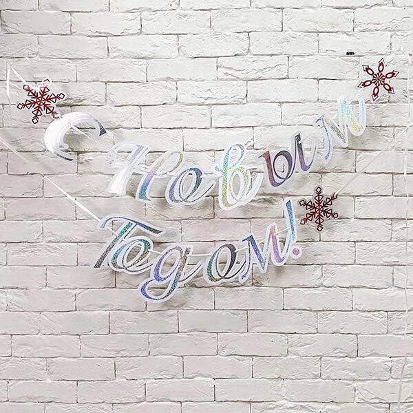 Поздравление с новым годом в самых зимних цветах – буквы искрятся как снег в морозный день. Пусть все желания сбудутся! Украсьте праздник голографической надписью С новым годом! Длина гирлянды 300 см, буквы скреплены между собой, на концах гирлянды петельки для удобного крепления.