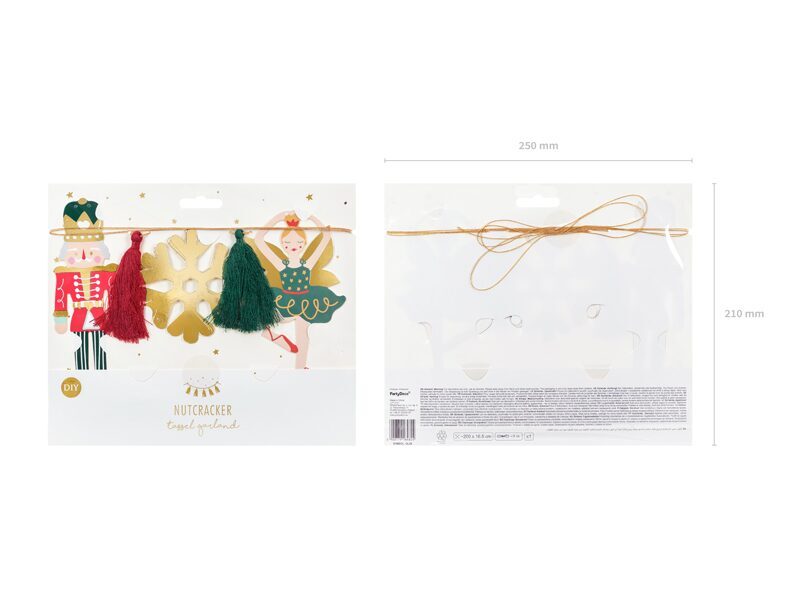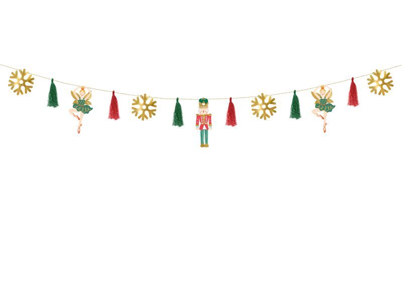 Гирлянда в классических рождественских цветах - алом и зеленом, белом и золоте. Щелкунчик и балерины, разделенные тассел-кисточками и золотыми снежинками. Производитель: PartyDeco.