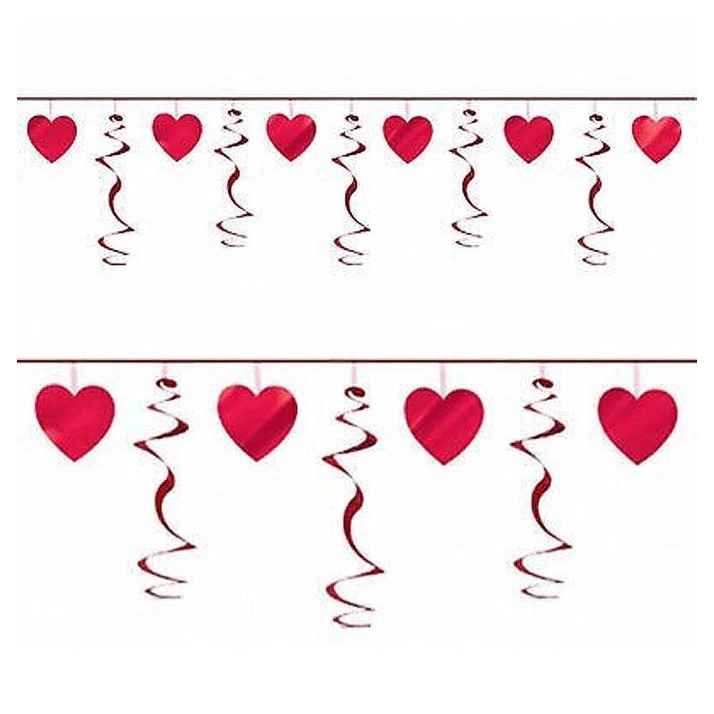 На горизонтальном красном шнуре расположились тонкие прозрачные ленточки с чередующимися красными фольгированными сердцами и спиральками- завитками. Длина гирлянды: 365 см.