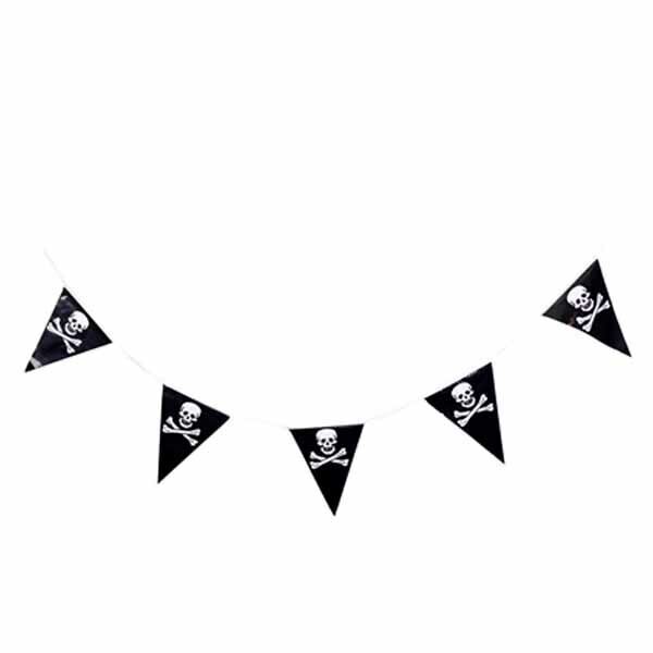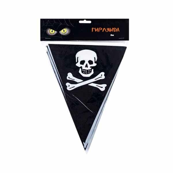 Полиэтиленовая гирлянды-вымпел - черные флажки с изображением Черепа - отличное решение для украшения интерьера на Хеллоуин, Пиратскую и др. тематическую вечеринку. Длина 6 метров.