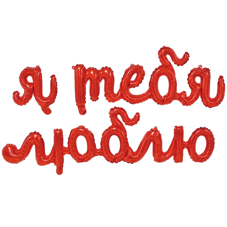 Фраза "Я ТЕБЯ ЛЮБЛЮ", изготовленная из полимерной фольгированной плёнки, станет прекрасным обозначением праздника. Текст фразы состоит из следующих деталей-слов (указаны размеры каждого элемента в надутом виде): «Я» - 21(w)*18cm(h), «ТЕБЯ» - 71(w)*31(h)cm, «ЛЮБЛЮ» - 100(w)*28 (h)cm. Каждая часть содержит клапан и хвостики для подвешивания с отверстиями. Инструкция: 1) надуваем каждую деталь воздухом с помощью входящей в комплект трубочки; 2) соединяем надутые элементы в фразу с помощью входящей в комплект ленты.
