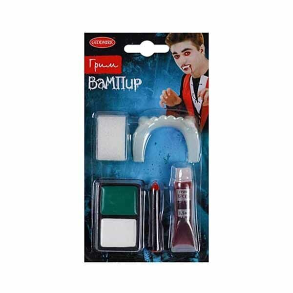 Грим предназначен для нанесения на одежду и кожу, чтобы создать образ Вампира к вечеинке "Хэлоуин". Легко наносится и смывается. Безопасен для детской кожи. Набор включает: зубы, грим в двух цветах (1г зелёного + 1г белого), спонж для нанесения, красный карандаш для макияжа (1.6г), тюбик грима "Кровь" (3.5ml).