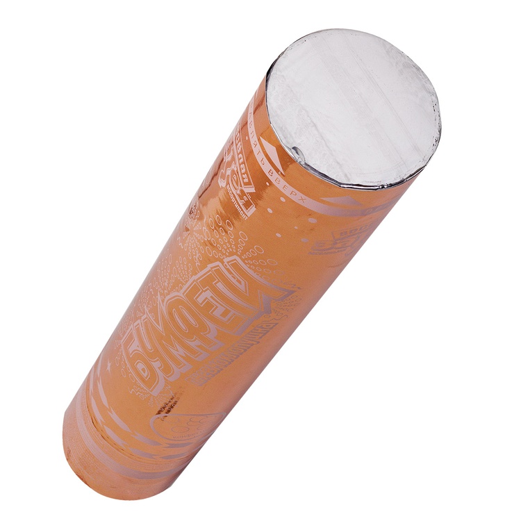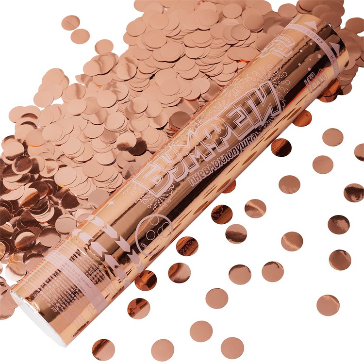 Пневматическое устройство, аналог хлопушки, абсолютно безопасное, предназначено для использования в помещении и на улице, дальность выстрела 6-8 м. Корпус хлопушки состоит из двух частей: пневматического баллона со сжатым воздухом и картонного цилиндра с наполнителем. Выстреливает круглым фольгированным конфетти цвета розовое золото. Размер: 30 см.