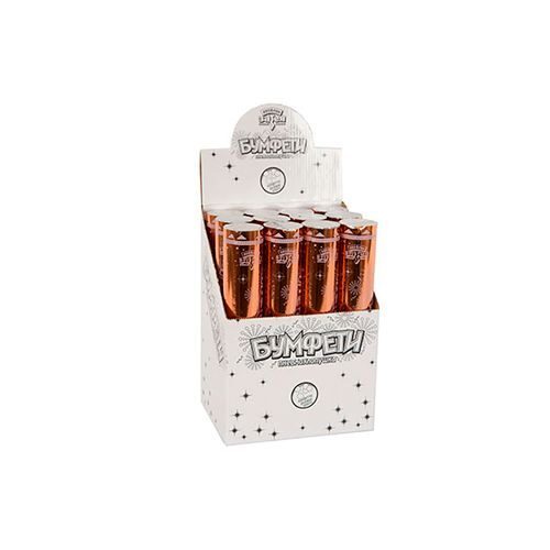 Пневматическое устройство, аналог хлопушки, абсолютно безопасное, предназначено для использования в помещении и на улице, дальность выстрела 6-8 м. Корпус хлопушки состоит из двух частей: пневматического баллона со сжатым воздухом и картонного цилиндра с наполнителем. Баллон изготовлен из металла, надежен и безопасен при хранении и в использовании, обладает высокой прочностью, чтобы выдержать давление воздуха. Выстреливает круглым фольгированным конфетти цвета розовое золото. Размер: 30 см.