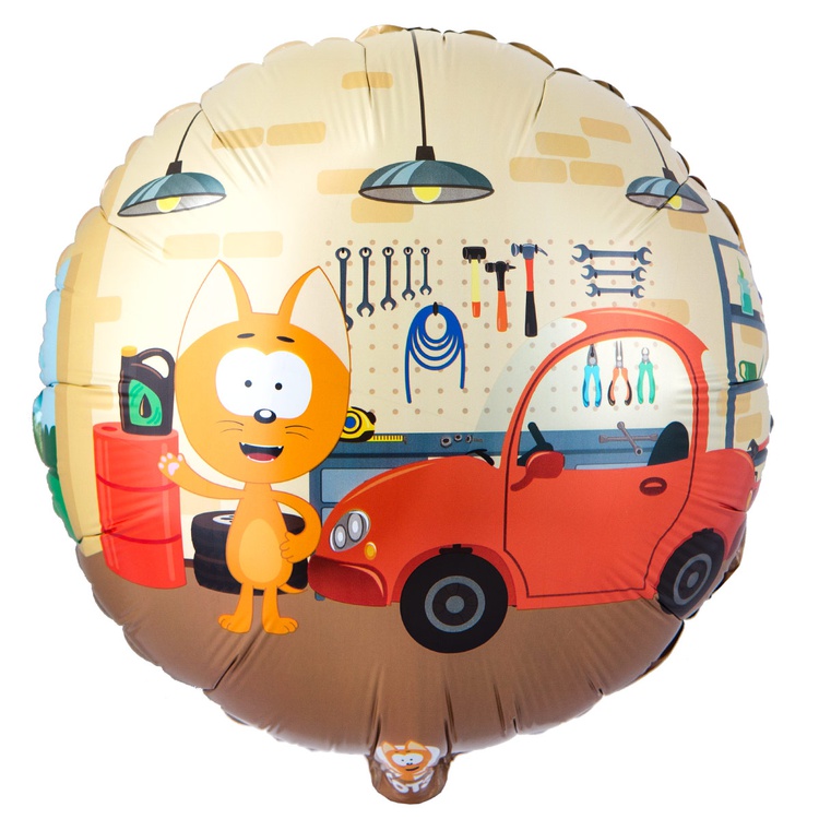 Воздушный фольгированный шар с изображением лицензионного персонажа – очаровательного Котёнка Котэ (главного персонажа популярного мультсериала) в гараже рядом с красной машиной. Шар смотрится красиво как самостоятельно, так и в качестве дополнения к фонтану из воздушных шаров.