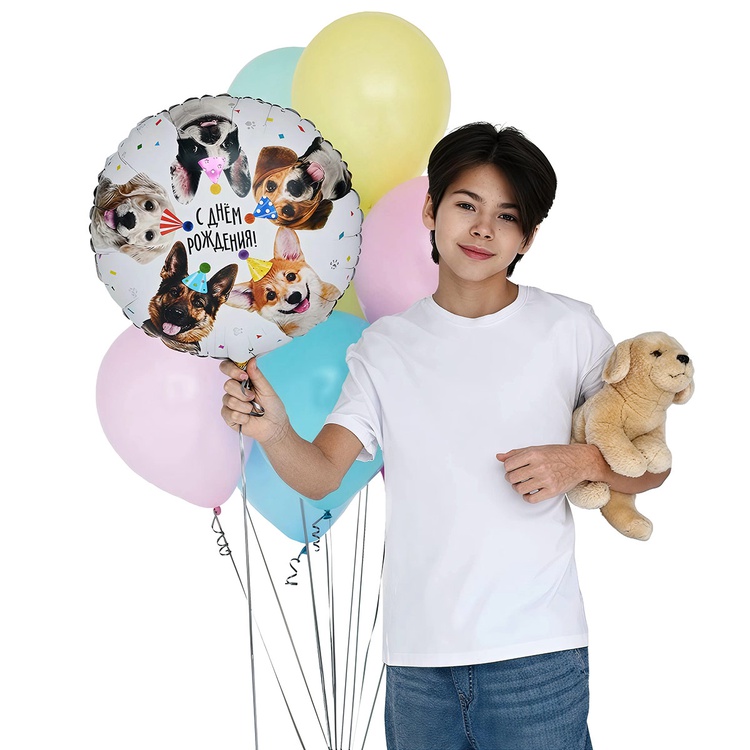 Этот фольгированный шар — настоящий праздник в миниатюре! Он мгновенно поднимает настроение и становится главным украшением любого дня рождения. В центре композиции — жизнерадостная надпись «С Днём рождения!» в стильном шрифте, окружённая разноцветными точками, словно конфетти, разбросанными в честь торжества. Вокруг надписи собрались пять очаровательных собак, каждая со своим характером и настроением.