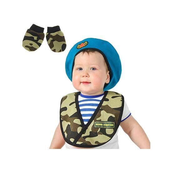 Мягкие варежки защитят чувствительную кожу малыша от холода и ветра, а нагрудник позволит крохе не испачкаться. Головной убор дополнит облик маленького защитника. А вы испытаете гордость за подрастающего патриота!