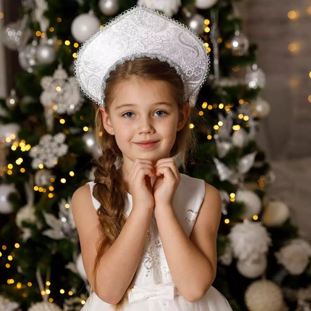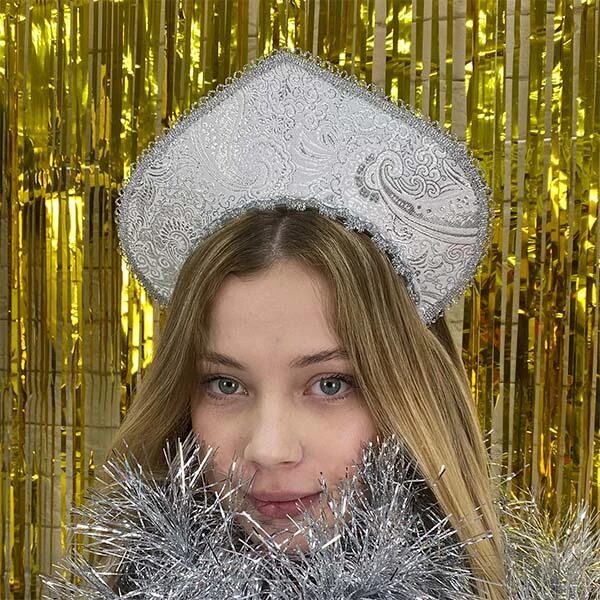 Атласный кокошник Снегурочки, который украсит ваш зимний праздничный образ. Кокошник закреплен на ободке, украшен серебристой мишурой.