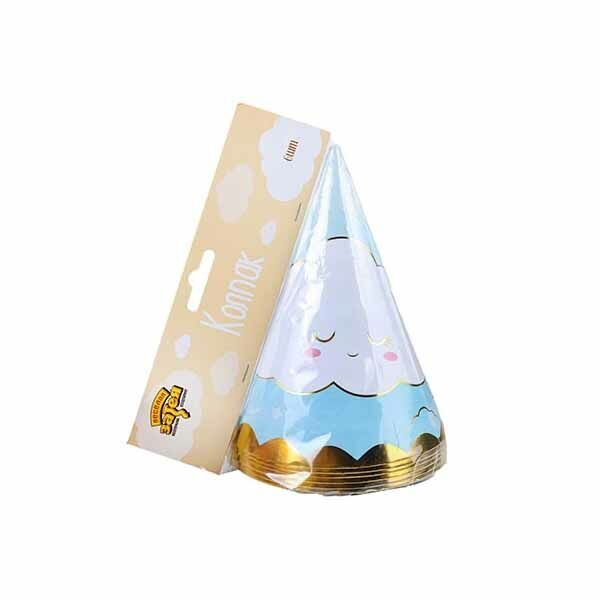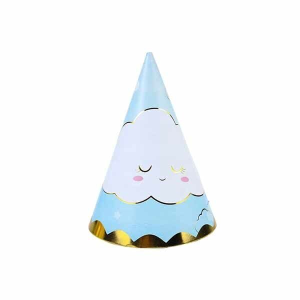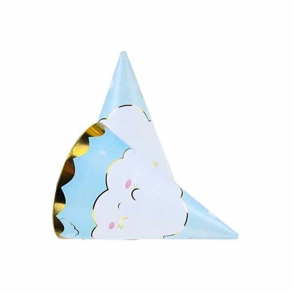 Спящие облака и звёзды, нежно хранящие самые светлые мечты и грёзы малышей! Мягкие оттенки розовой ванили и небесно-голубого, подчеркнутые тонкими золотыми нитями. В упаковке 6 голубых бумажных колпачков на резинках.