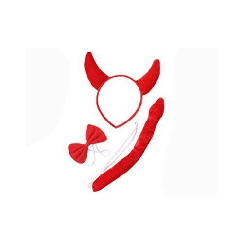 Карнавальный комплект прекрасно подойдет для празднования Хэллоуина или другой тематической вечеринки. Всего несколько ярких деталей и образ красного дьявола готов! В набор входят 3 предмета: рога на ободке, галстук-бабочка на резинке и длинный хвост с острым наконечником.