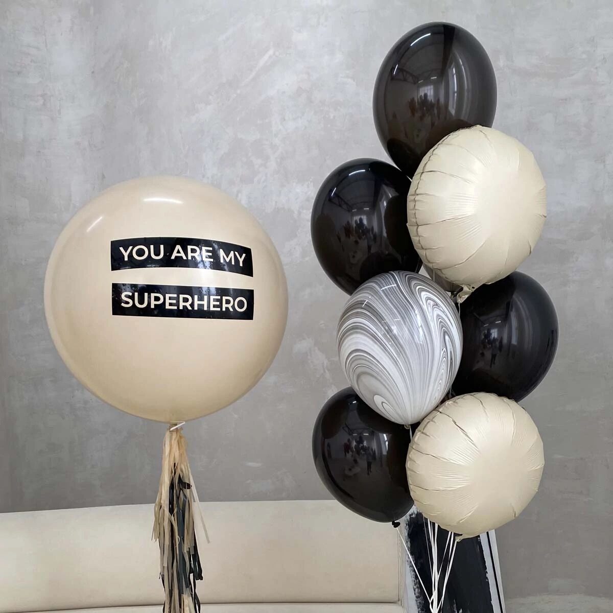 - Фонтан из шаров (3 фольгированных круга, 2 латексных шара агат, 4 шара однотонных пастель)
