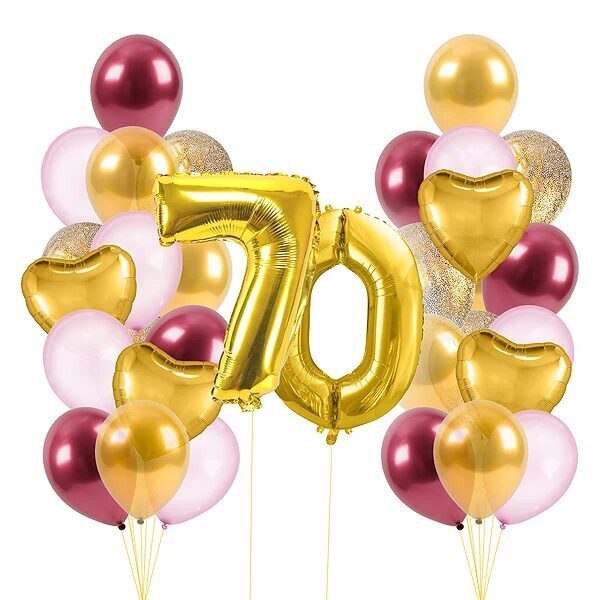 Яркая композиция из воздушных шаров на юбилей 70 лет. Такая композиция из воздушных шаров с цифрами и золотыми сердцами одинаково понравится как вашей бабушке, так и дедушке. Отличное решение для оформления праздника в квартире или ресторане. Все будут в восторге от таких ярких воздушных шаров с цифрами.