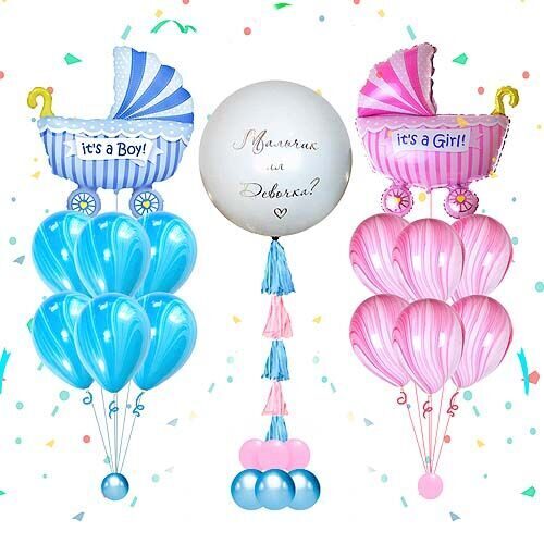 - Наполнение шара: конфетти и воздушные шары, согласно полу ребенка