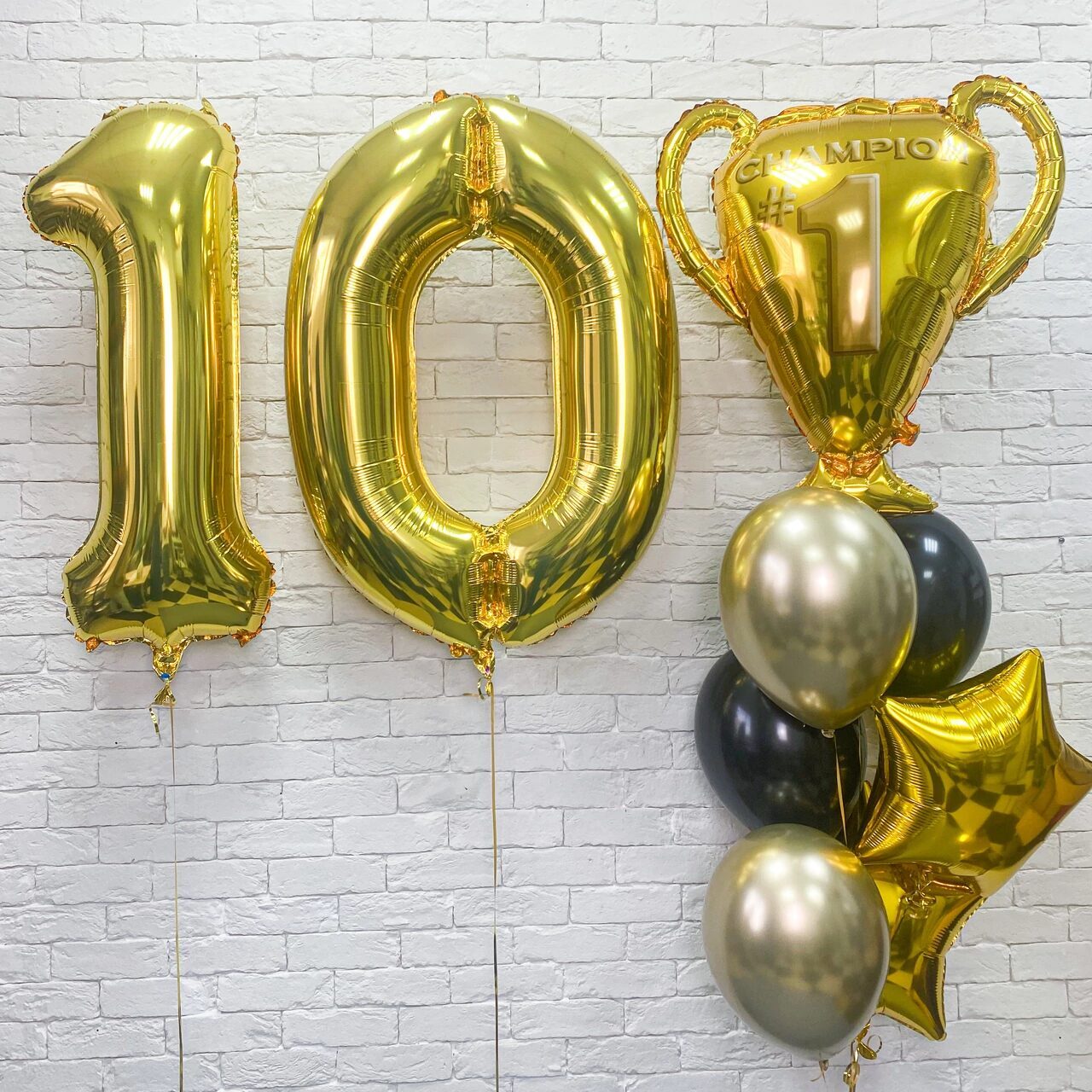 - Фонтан из шаров (Кубок чемпиона, 2 латексных шара хром, 2 латексных шара пастель, 2 фольгированные звезды)
