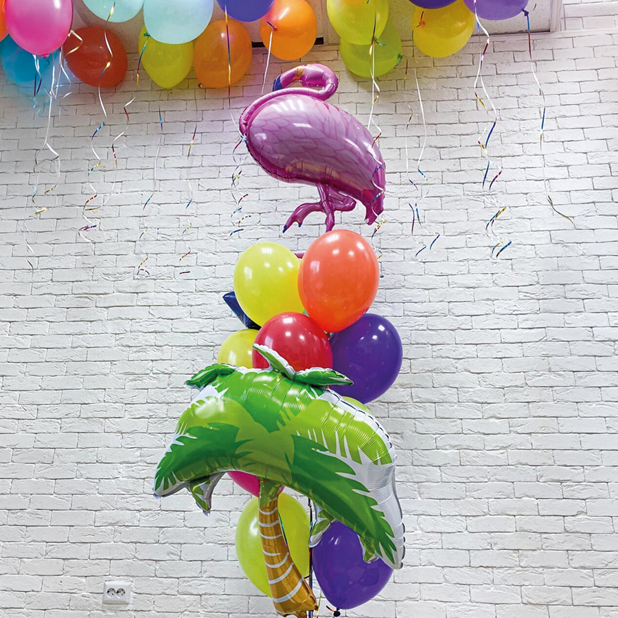 - Фонтан из 12 шаров (фольгированный шар фламинго 1шт - 1207-0153, фольгированный шар пальма 1шт - 1207-1735, звезда 1шт., латексный шар ассорти 9шт.)