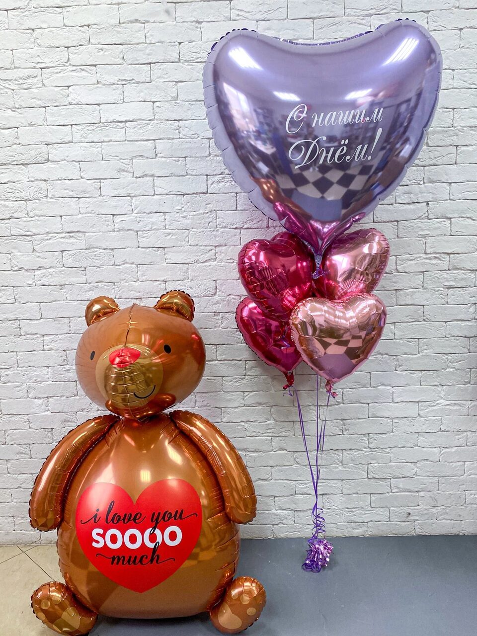 - Фонтан из шаров (1 большое сердце с индивидуальной надписью, 4 фольгированных маленьких сердца)