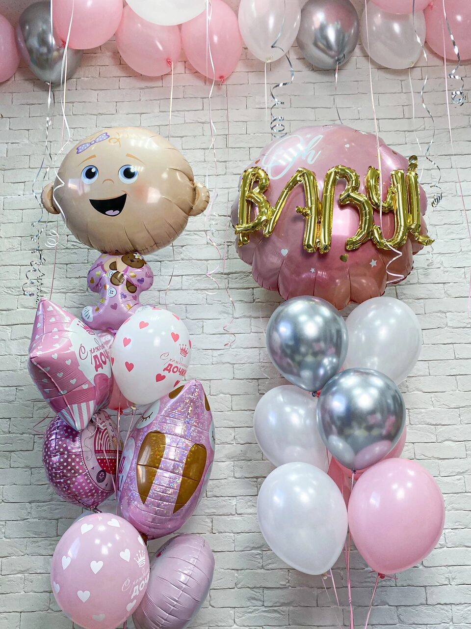 - Фонтан из 10 шаров (Большой фигурный шар "Baby", 3 латексных шара металлик, 3 латексных шара пастель, 3 латексных шара хром)