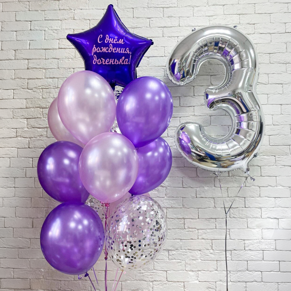 - Фонтан из шаров (1 звезда с индивидуальной надписью, 3 латексных шара с конфетти, 9 латексных шаров металлик)