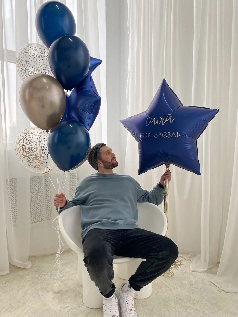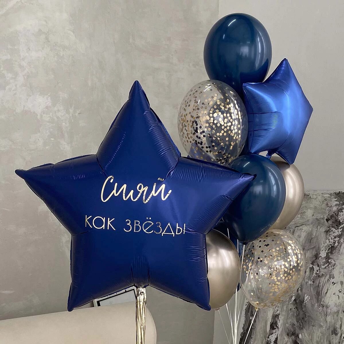 - Фонтан из шаров (2 фольгированных звезды, 2 прозрачных шара с конфетти, 3 шара однотонных пастель, 1 латексный шар хром)