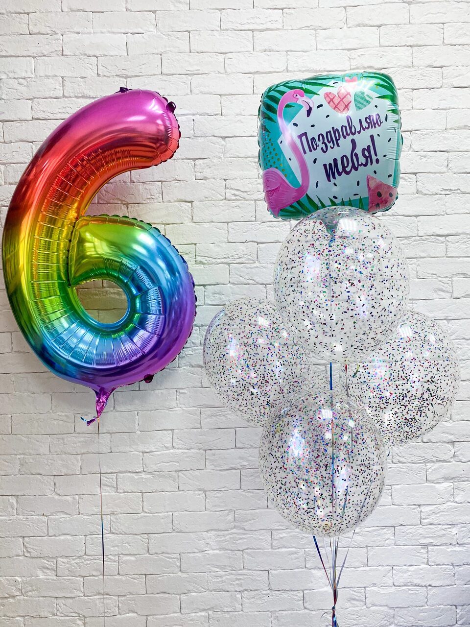 - Фонтан из шаров (1 фольгированный шар с рисунком, 6 латексных шаров с конфетти)